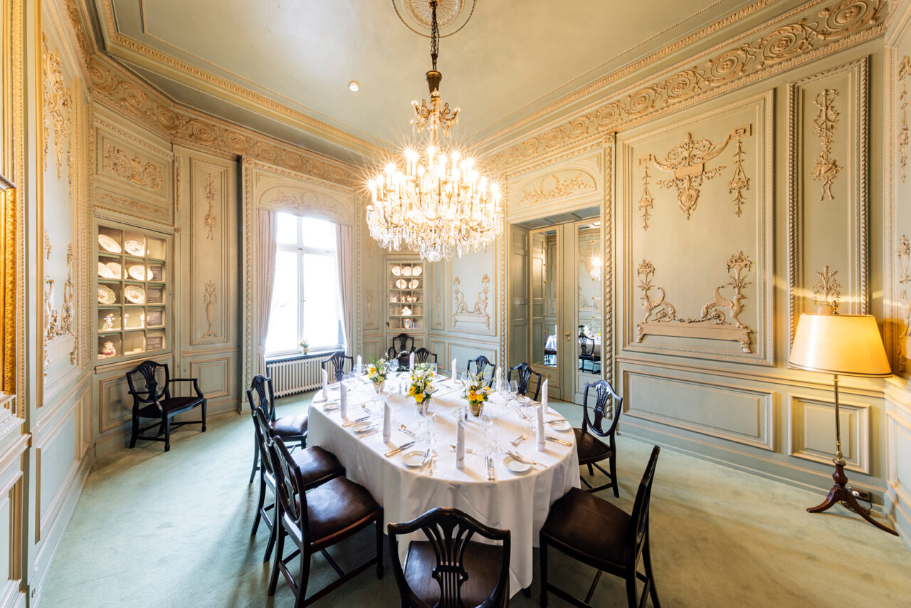 Die Räume des Amsinck-Hauses – imposant: Der große Festsaal mit opulenter Ornamentik und geschnitzten Türbekrönungen zeigt viele Elemente der Erbauerzeit. Zwei Alsterzimmer mit Blick auf die Binnenalster, der Rote Salon und das Jenisch-Zimmer im Empire-Stil werden heute als stilvolle Restaurant-Räume genutzt.