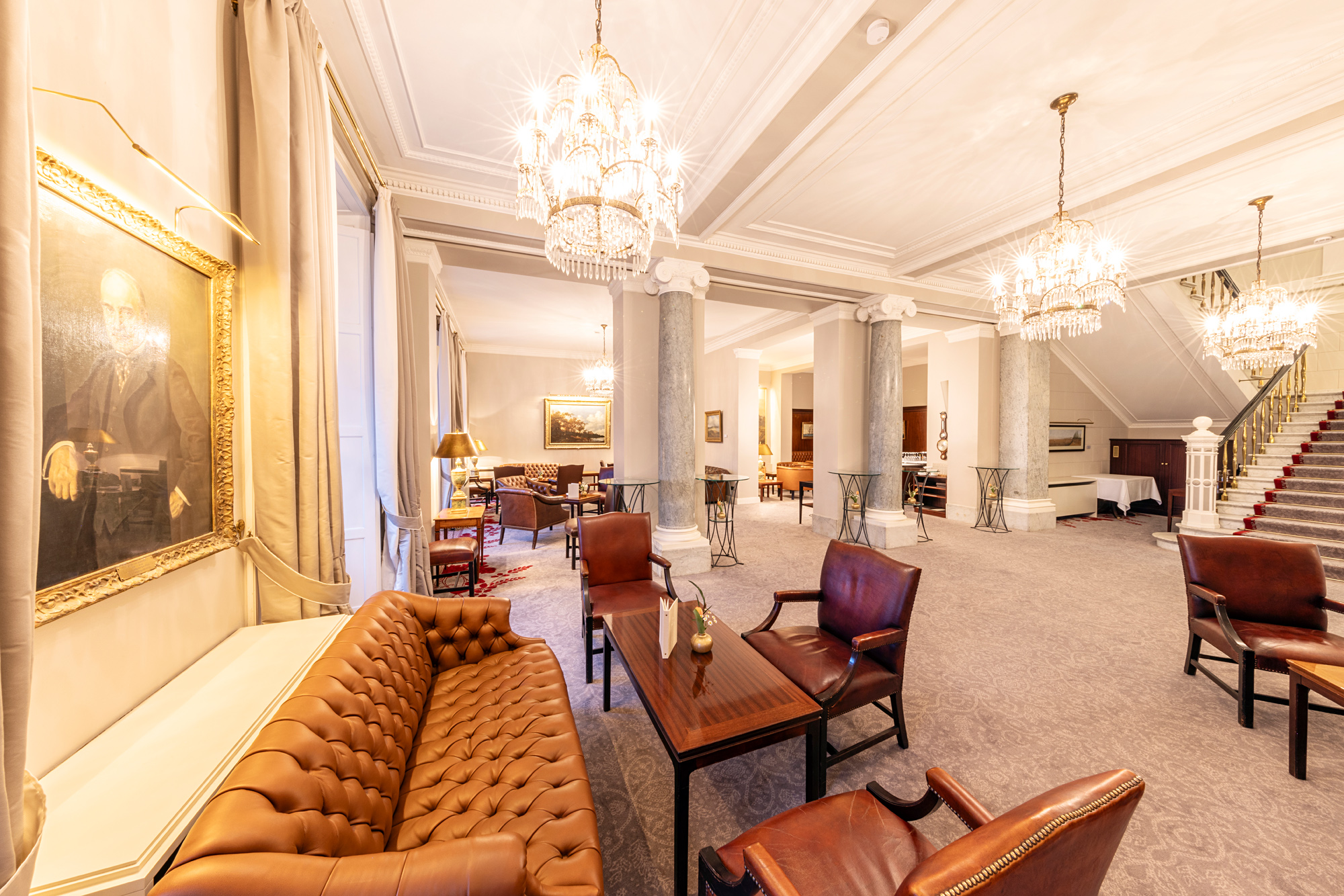 Unvergleichlich. Charakteristisch. Legendär. Stilvoll. Die weitläufige Halle im Erdgeschoss des Übersee-Clubs war und ist der Ort der Begegnungen, des Dialogs, aber auch des Rückzugs. Die Türen mit den alten geschnitzten Dreieckgiebeln aus der Erbauungszeit und die Stuckmarmorsäulen aus dem Jahr 1900 blieben erhalten. Mit ihrem durchgehenden Teppichbelag und den dunklen Ledermöbeln nach englischem Vorbild, einer antiken Uhr, Kronleuchtern sowie Ölgemälden des 19. Jahrhunderts aus der Sammlung der Familie Jenisch entspricht die Halle dem Stil des Hauses. Sie bietet seit jeher eine behagliche und zugleich gediegene Umgebung für Vorträge, Meetings, Tagungen oder private Feierlichkeiten. Ob klassisch oder modern – lassen Sie sich von der Wandlungsfähigkeit überraschen!